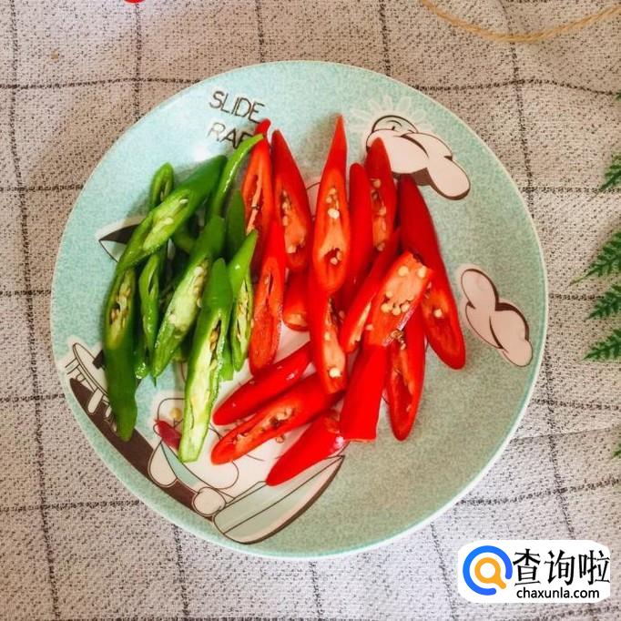 然后把红绿辣椒斜切成片备用,等到锅中的水份所剩无几了就将红绿辣椒倒入锅中翻炒一下就可以出锅了。