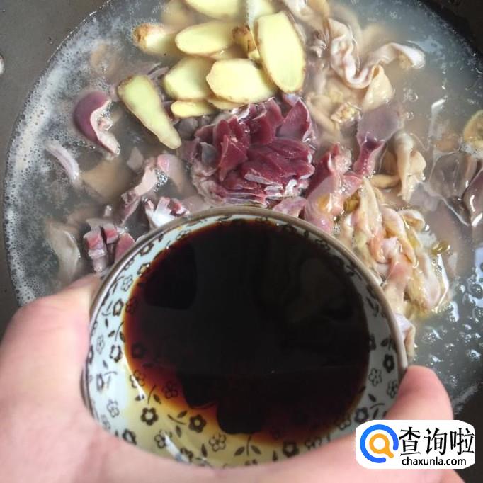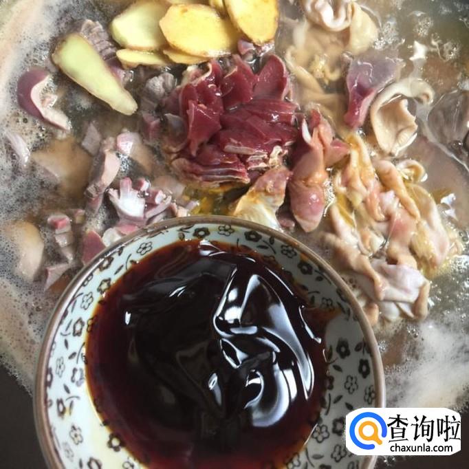 然后往锅中加入两勺的酱油和两勺的蚝油,如下图所示。小贴士:蚝油和酱油不仅有提鲜的效果而且还能够让鸡杂更好的上色。所以大家不要忘记加蚝油和酱油了。