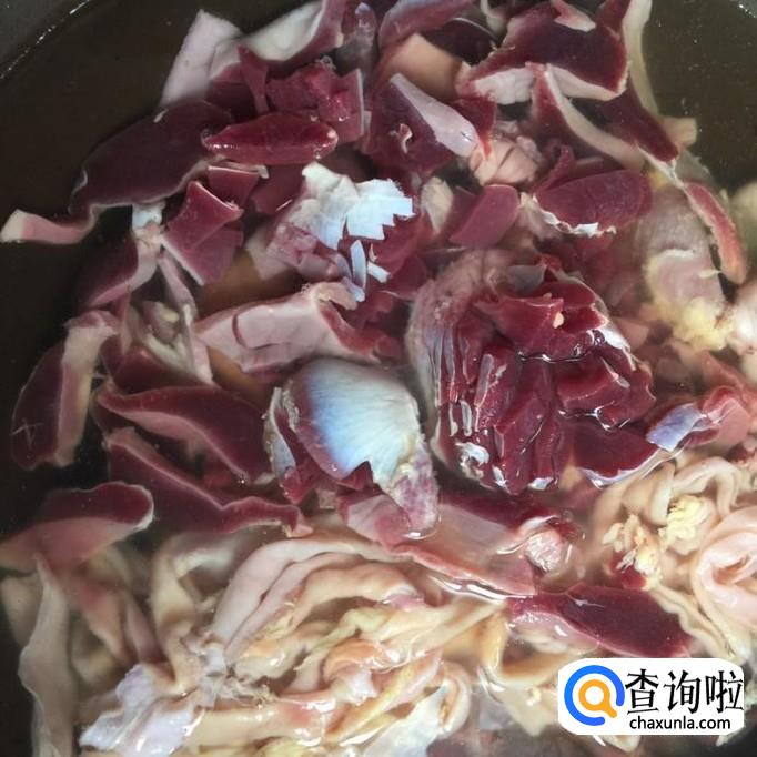 然后锅中放入适量的清水,把鸡杂倒入锅中,如下图所示。小贴士:关于清水的用量,小编建议大家最好选择正好漫过食材的水量就差不多了。如果你水放的太多,是十分耗时间的。这一点大家一定要注意。