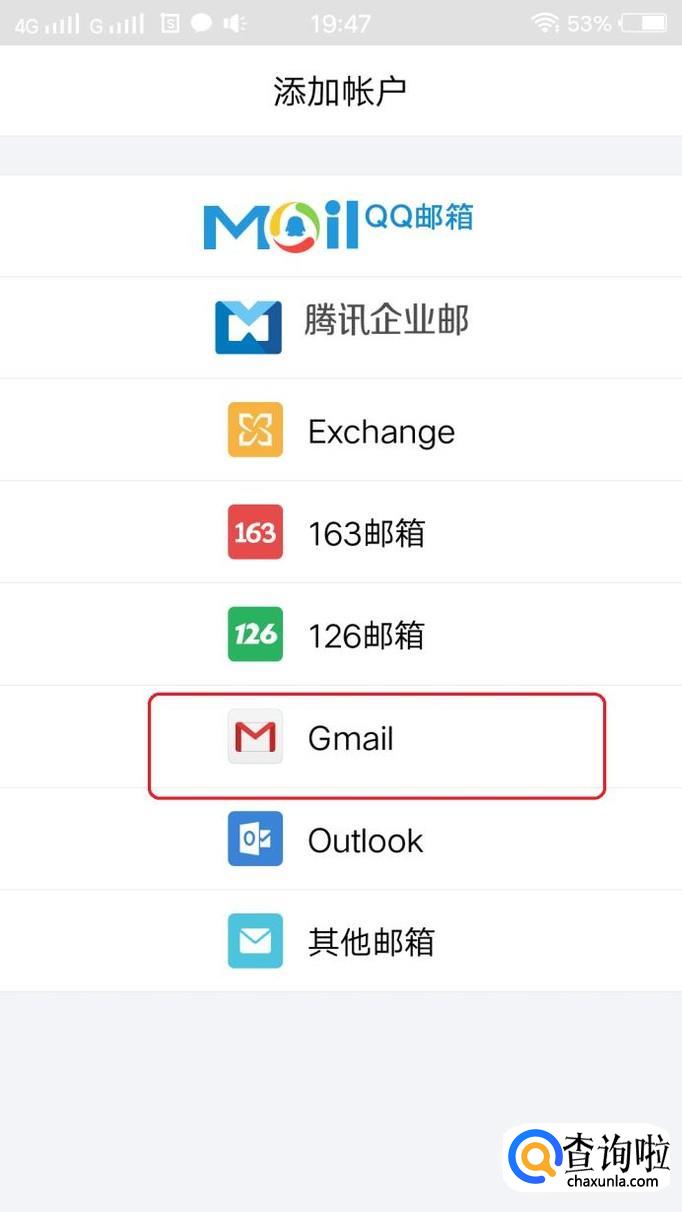 打开QQ邮箱app,如图所示,会出现提示,要求添加账户,一般我们都会直接点击QQ邮箱,添加并登录,但这里我们点击“Gmail”,如图所示。