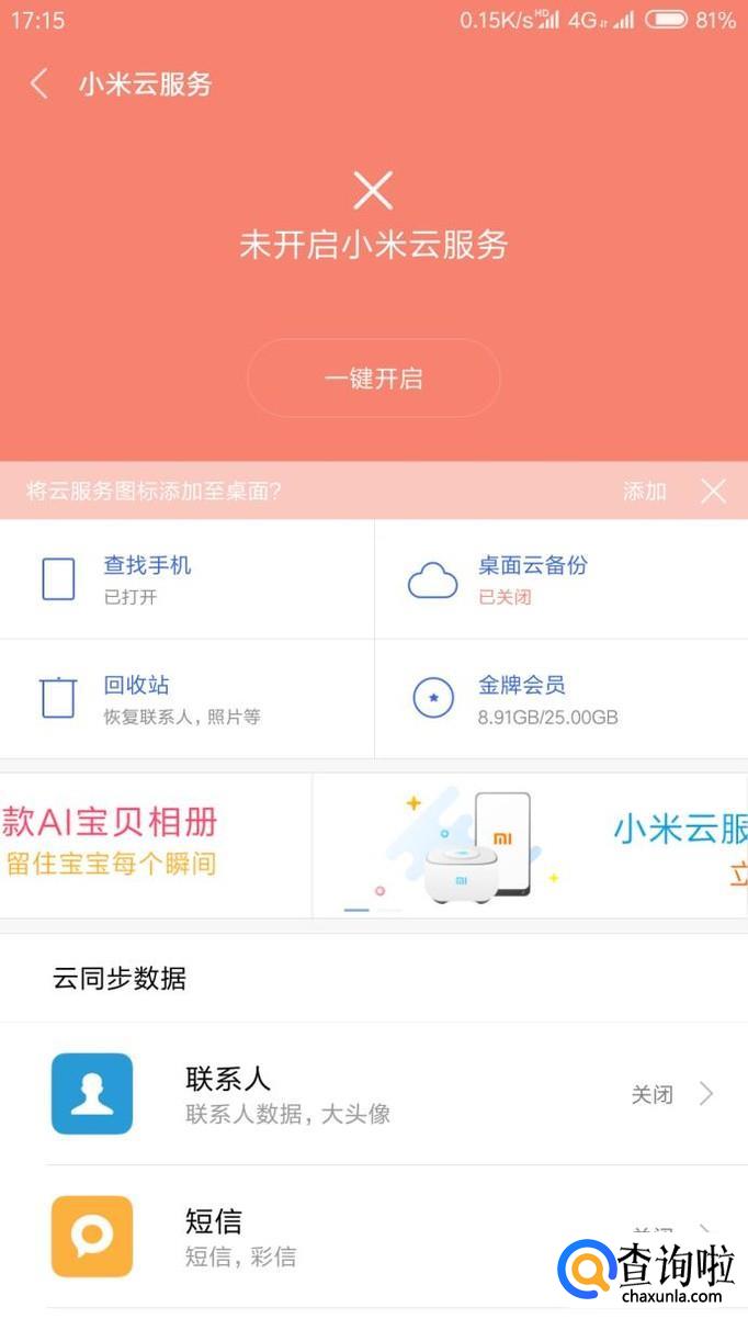 注意,如果小米云服务默认是关闭的话要先打开小米云服务才能进行备份和查看,点击‘回收站‘。