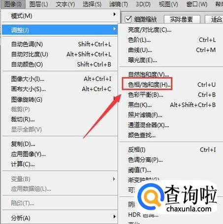 打开图片之后我们再在图像菜单那里找到调整选项,点击调整选项在其内找到色相饱和度选项,如图所示: