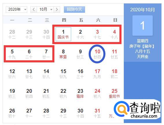 2020年中秋节/国庆节都在10月1日,星期四。因为这两个节日是在同一天的,所以这两个节日是同时放假。
