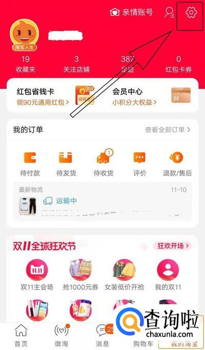 切换“我的淘宝”,点击右上方“设置”。