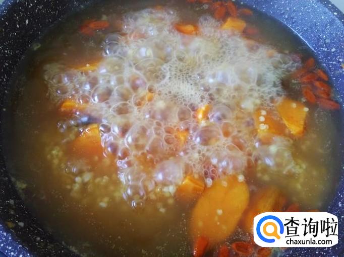 把红薯、小米、黄精、枸杞放到锅里加水,水和食材的比例是1-1。