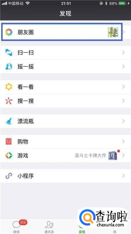 首先点击微信中的朋友圈,如下图所示。