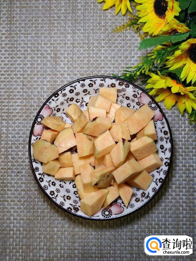 将山药去皮后,切成小片儿,将红薯去皮后切成小块,分别放入盘中备用。小贴士:在处理山药的时候,一定要戴上一次性的手套,尽量不要让粘液沾到自己的手上,否则会引起皮肤发痒。