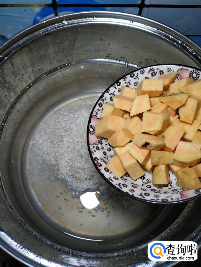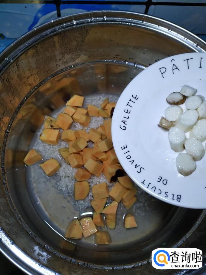将之前切好的红薯块倒入锅中,将山药块也倒入锅中。