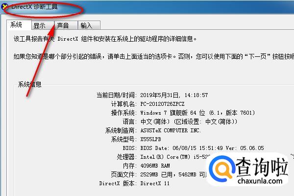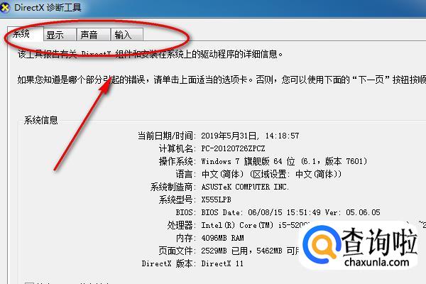 directx诊断工具里面对于系统、显示屏、声音、输入端的设备配置和情况都有详细的说明。