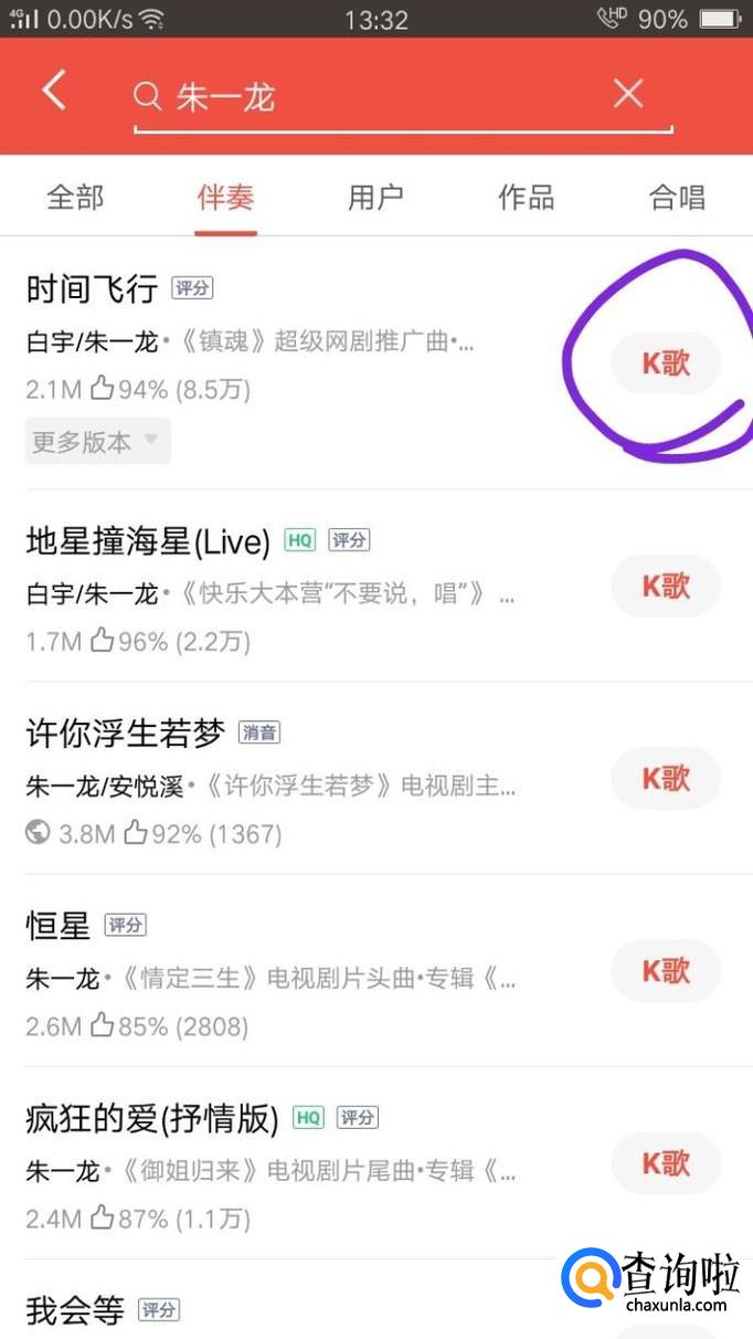 搜索自己想要唱的歌曲,点击“K歌”。