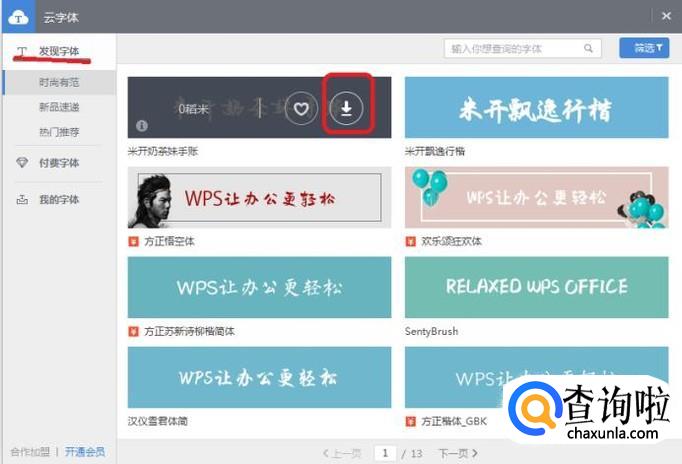 出现“云字体”选项框,在“发现字体”栏目下,可以找到很多“0稻米”的字体格式,我们任选一个点击下载。