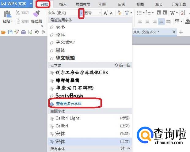点击“开始”,然后点击字体旁边的下拉菜单箭头,在下拉菜单中选择“查看更多云字体”。
