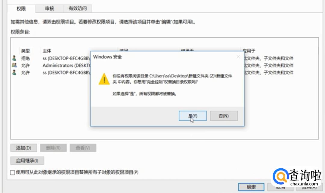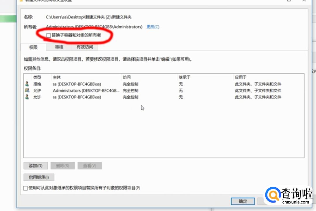 再次确定,在弹出窗口中,勾选“替换子容器和对象的所有者”,此时的所有者已经更改为Administrators