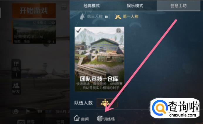 进入切换模式之后,我们点击下端的训练场,如图中粉色箭头所示。