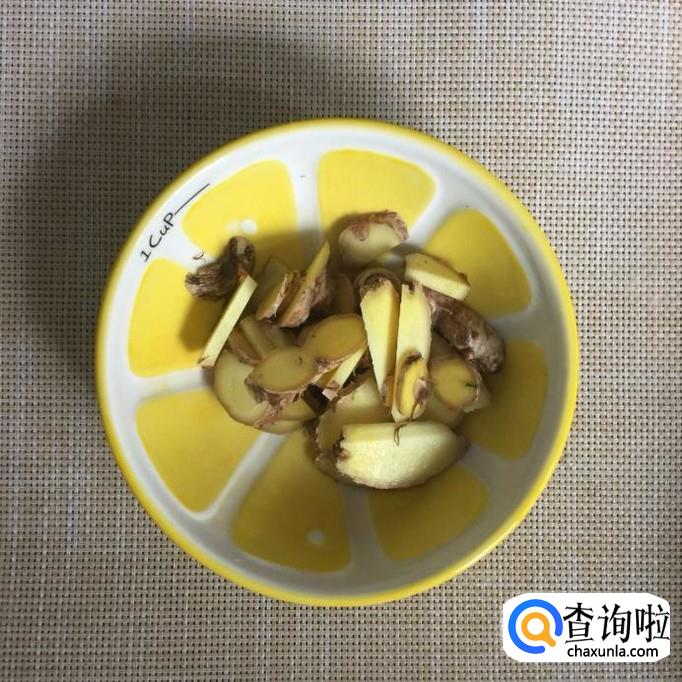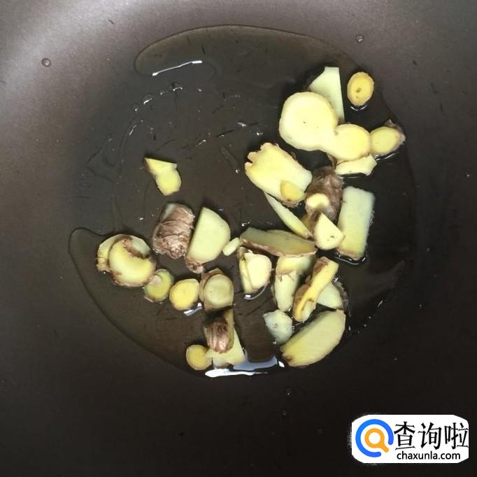 首先将生姜切成片,锅中放入适量的茶油,待油冒烟,倒入姜片爆香。