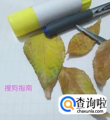准备一张纸,几片树叶,一把剪刀,一个胶棒,一支水笔。