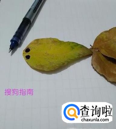 用水笔在小鱼头部叶脉两侧各点一个圆点,表示小鱼的眼睛,树叶小鱼就做完了。