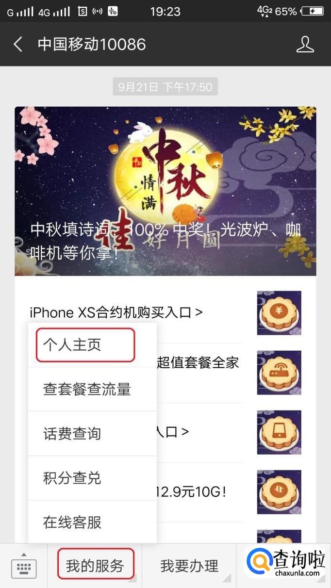 进入公众号以后,绑定移动手机,然后如图所示,点击“我的服务”,“个人主页”。