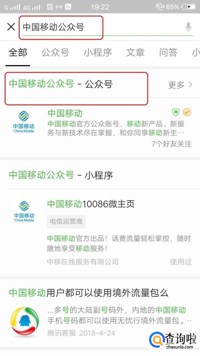 首先,我们打开微信,搜索“中国移动公众号”,找到并关注。