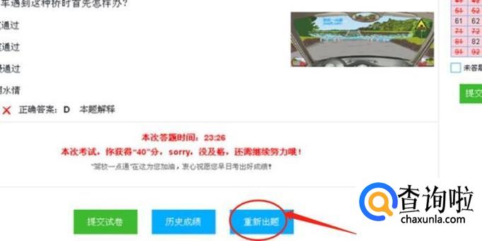 提交试卷后,就会看到自己的成绩了,如果还要接着训练,就点击“重新出题”按钮,继续模拟训练。就按照上述的步骤和方法,反复进行模拟训练,直到每次的答题成绩都在九十分以上,没有特殊情况出现,那么你的科目一考试就一定能过关了。