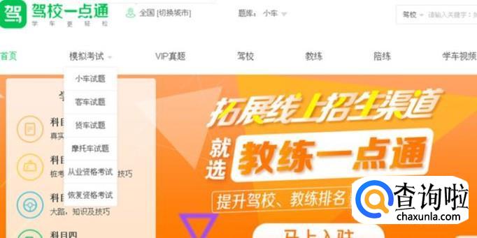 打开驾校一点通官网后,就会出现下面的页面,然后把鼠标放在模拟考试这几个字上,就会出现一个下拉菜单如下图: