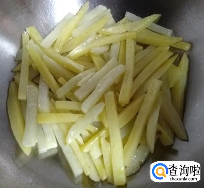 然后将土豆条放到油锅里翻滚,使每根土豆条都裹上油;