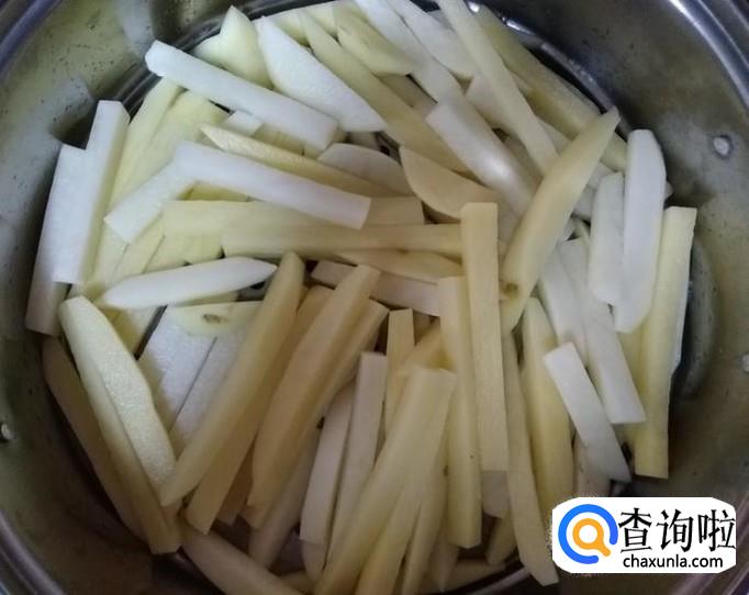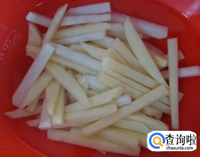 洗掉土豆条表面的淀粉,用清水浸泡30分钟;