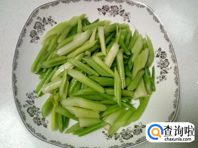 芹菜收拾清洗干净,控干水分,切成寸段。放入开水中焯一下,入锅几秒钟即捞出,迅速用冷水过凉,沥干水分,备用。