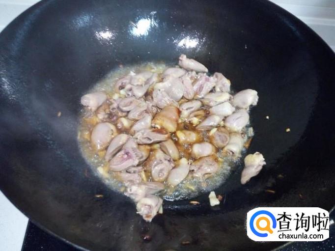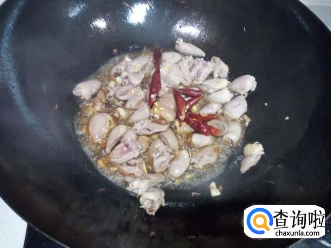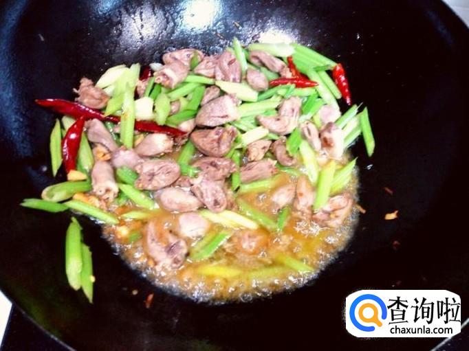锅里放入油加热,油热后放入花椒,葱,姜,蒜爆锅。放入鸡心翻炒,放入料酒,酱油,滴少许醋。
