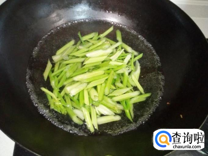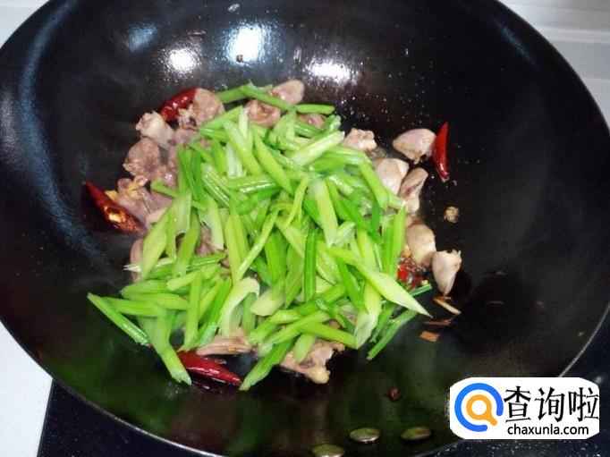 放入红干椒稍翻炒一下,放入芹菜快速翻炒,放入盐。
