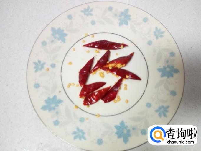红干椒用水冲洗一下,控干水分,斜刀切成对半。切好葱,姜,蒜,备用。
