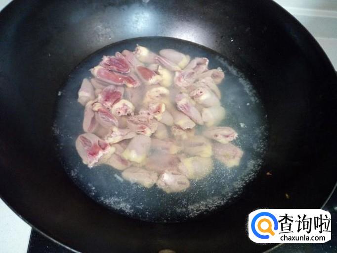 鸡心用水清洗干净,控干水分,用刀切成对半。放入开水中焯一下,入锅几秒钟即捞出,用凉水冲洗掉上面的血水和沫子,淋干水分,备用。