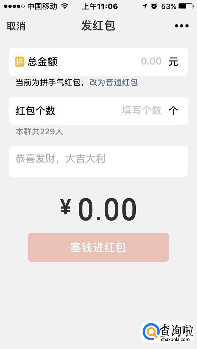 拼手气红包更受微信群成员的欢迎,你发送的时候,只需要确定红包个数和总金额就可以了。普通红包需要确定的是红包单个金额和红包个数。两种红包都可以试试。