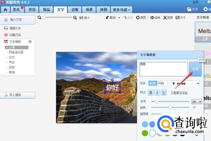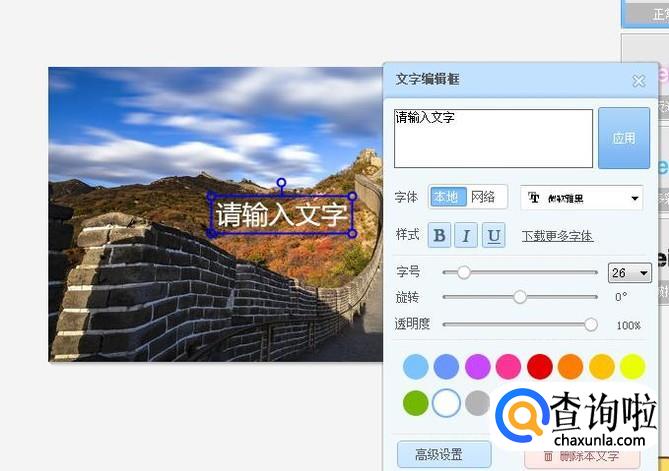 在请输入文字的框框里打出你所需要的文字后在点击应用即可添加,如图