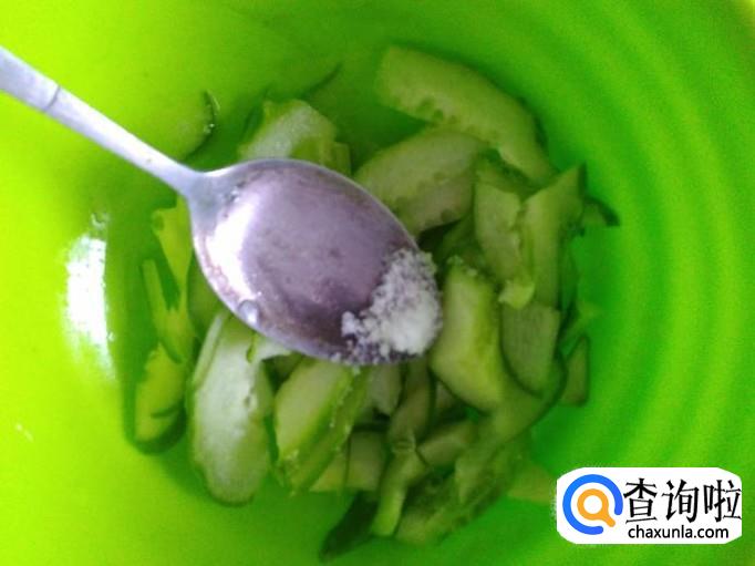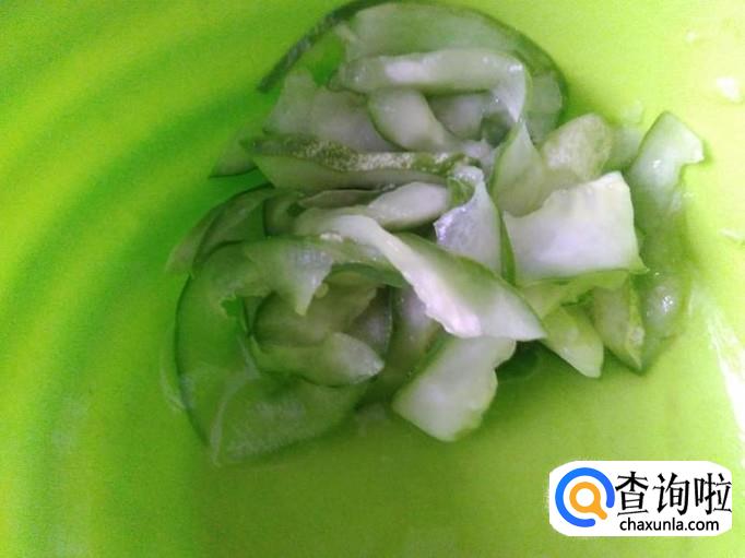 把黄瓜洗干净切成小片,加点盐花把黄瓜腌制软。