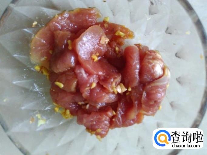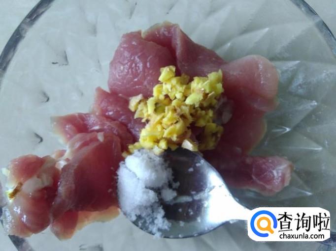 瘦肉切成薄片,加适量的盐、姜蓉、1勺生抽腌制几分钟。