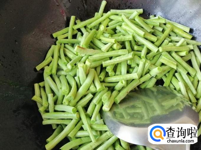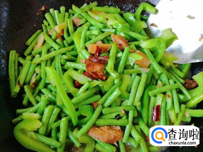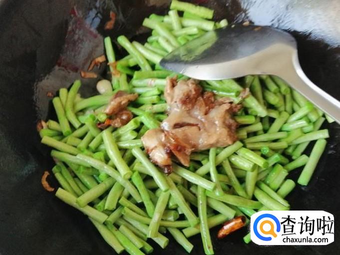 把放进去翻炒了片刻的豆角,如图加入事先备好适量的熟猪肉,再继续翻炒均匀,这个时候可以加入一点水,防止过干把菜炒糊了,最好是加适量热水。