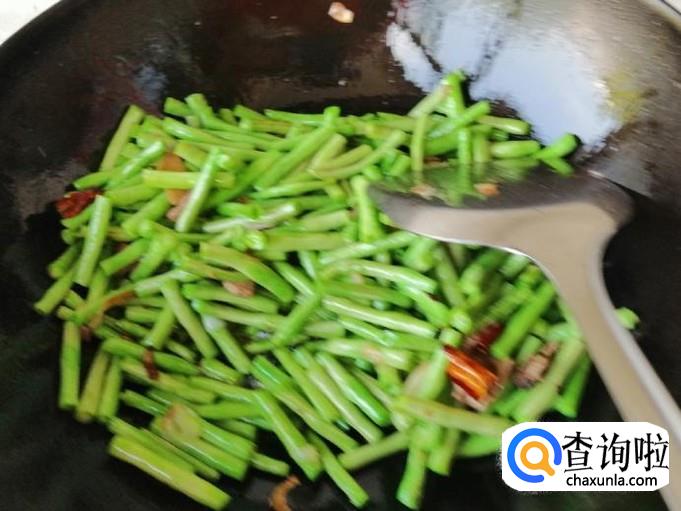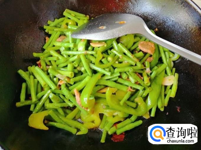 翻炒到豆角明显变软如图所示,加入早备好的菜椒,翻炒均匀,炒菜过程中要勤翻炒,不要离开以免炒糊,家里有老人孩子的可以用小火多闷一会。