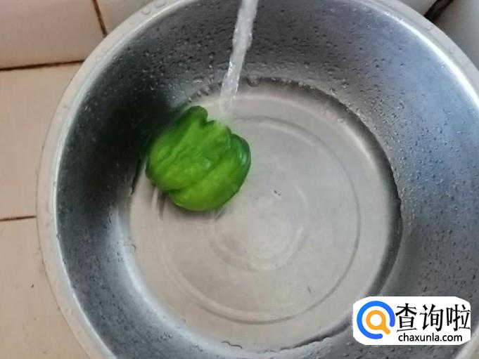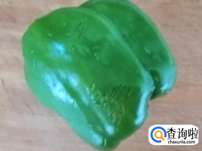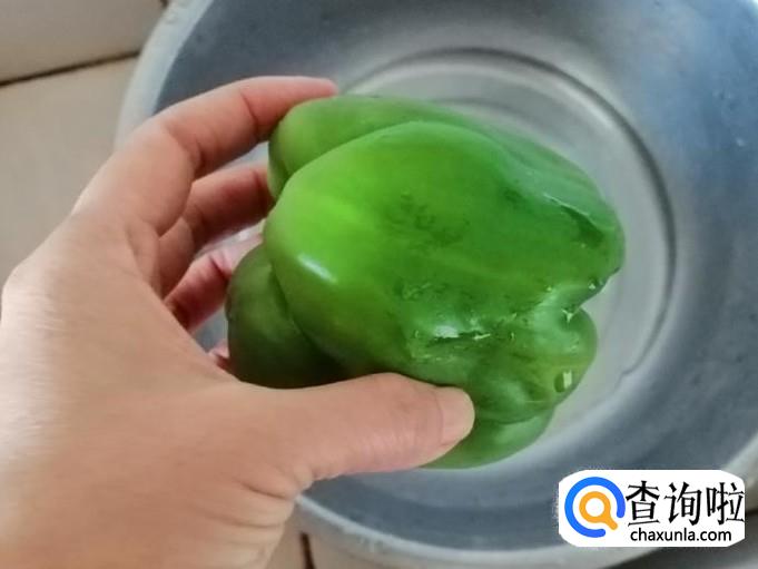 取一个青椒,放入洗菜盆用手把表面揉搓清洗干净,洗好去菜椒把,放在菜板待用,这里所用的菜椒最好是选用红色,配上去会更好看,没红的就只好用青菜椒一样,营养价值上区别不大。