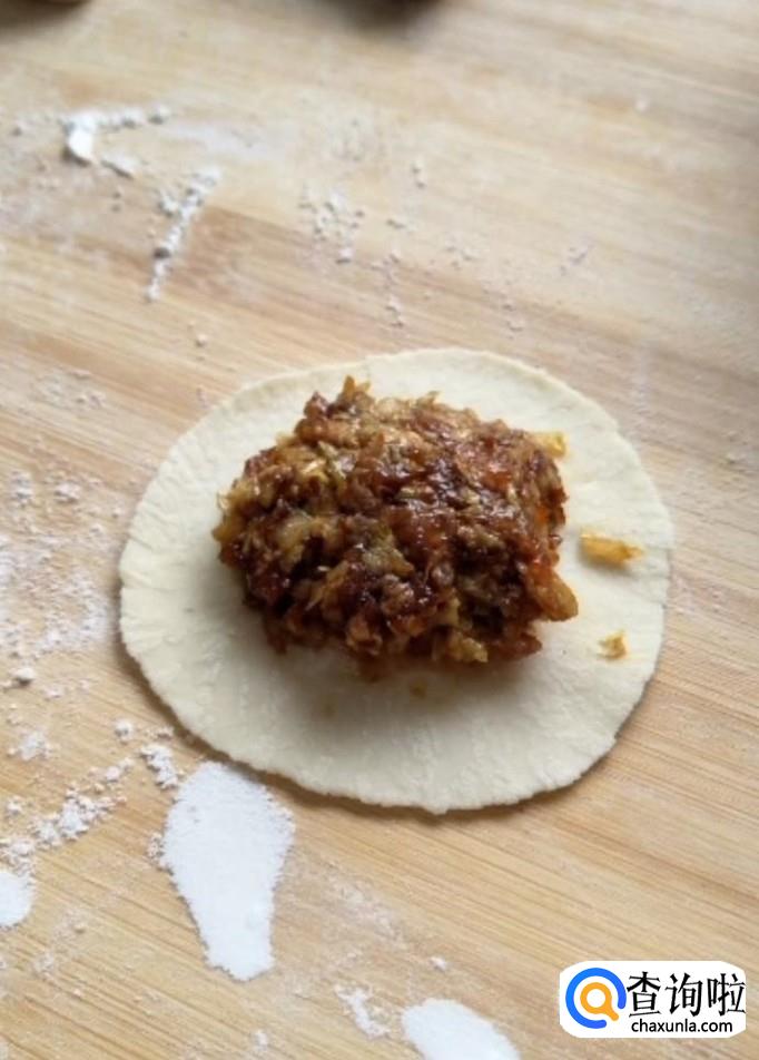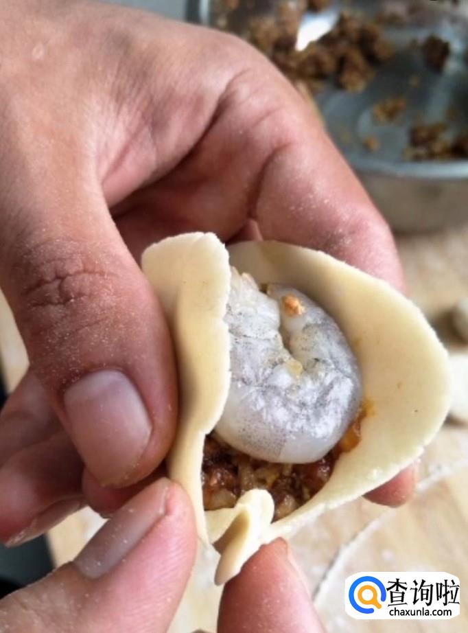 接着我们把肉馅放在饺子皮上面,再放上一个虾仁,先用手从低端捏一下如图所示