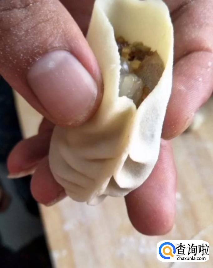 然后从左边折一下捏一下,再从右边折一下捏一下,如图所示,重复这个动作一直到饺子另一端
