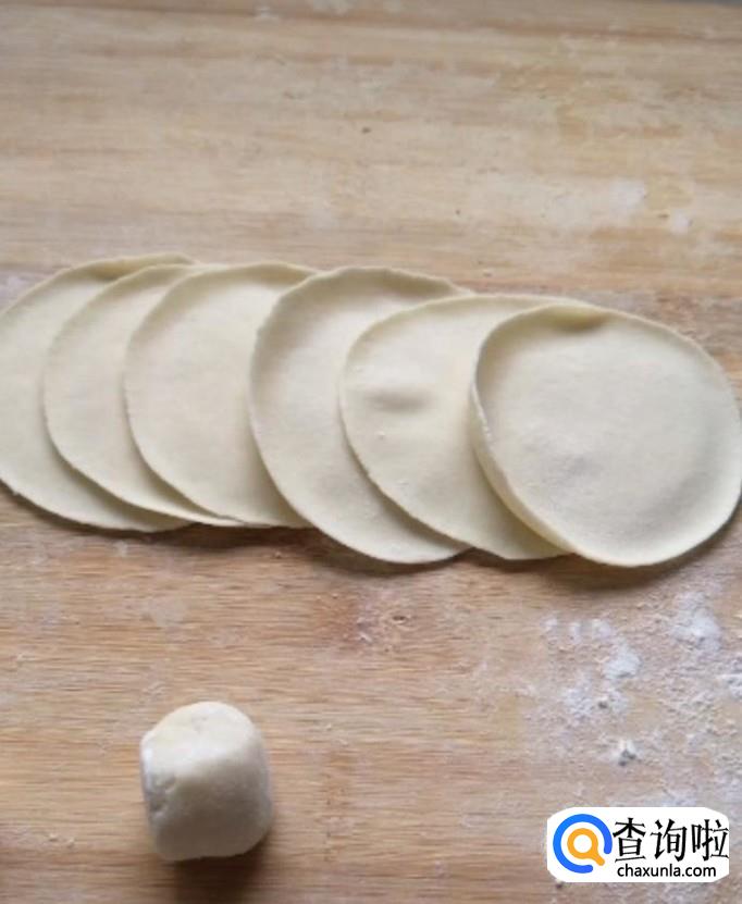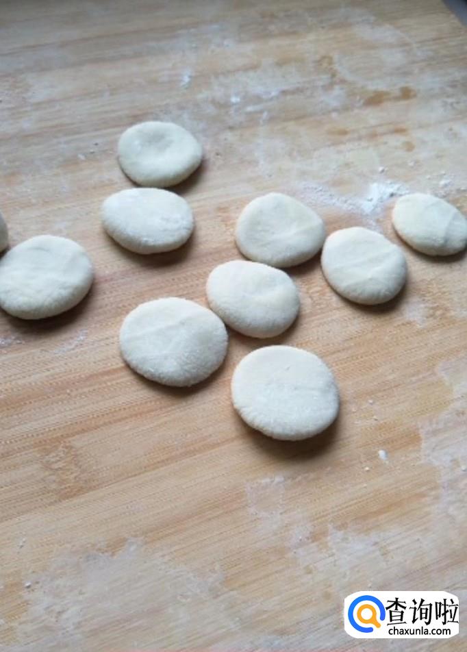 然后我们把剂子按扁,用擀面杖擀成皮,四周薄一些