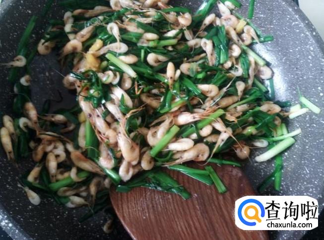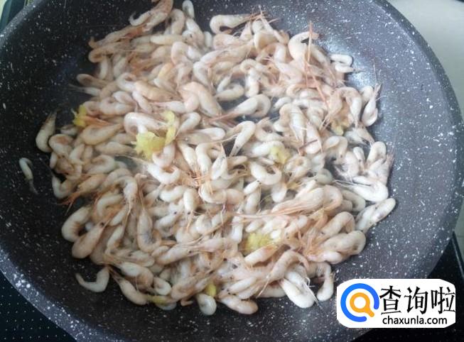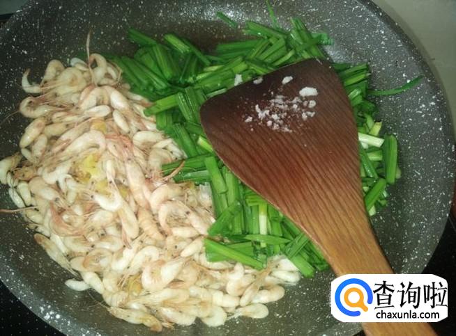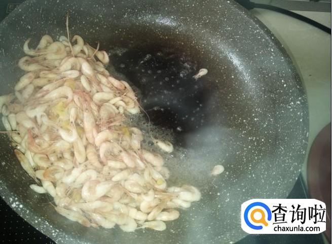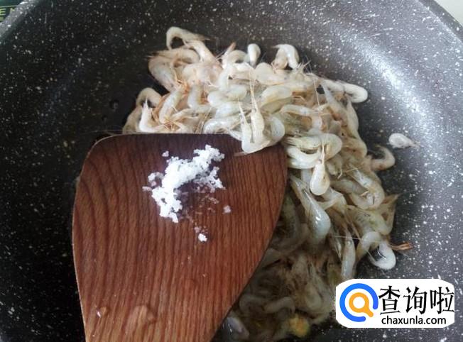 放小虾进去,加适量的盐翻炒至变色。