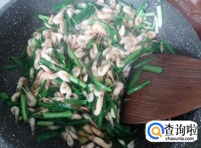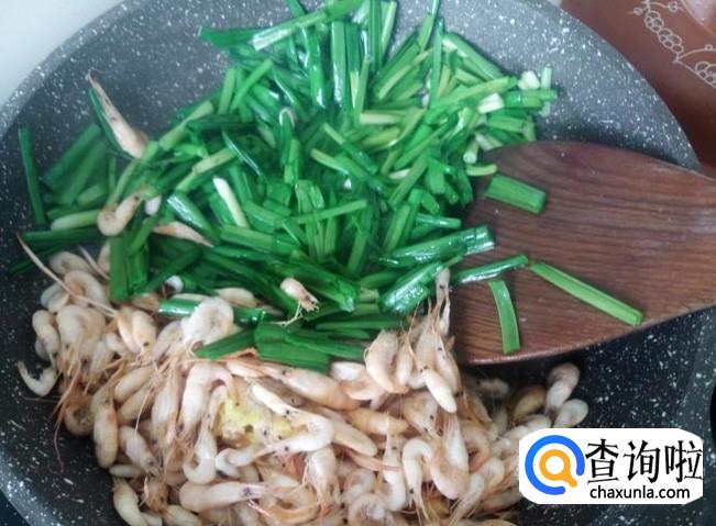 韭菜下锅,加适量的盐煸炒至软。