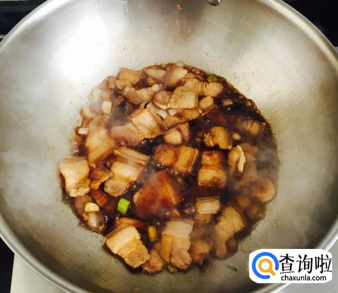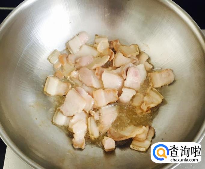 热锅加入适量的猪大油把五花肉片炒香,放入葱花、姜片、蒜片爆香,料酒、生抽烹锅