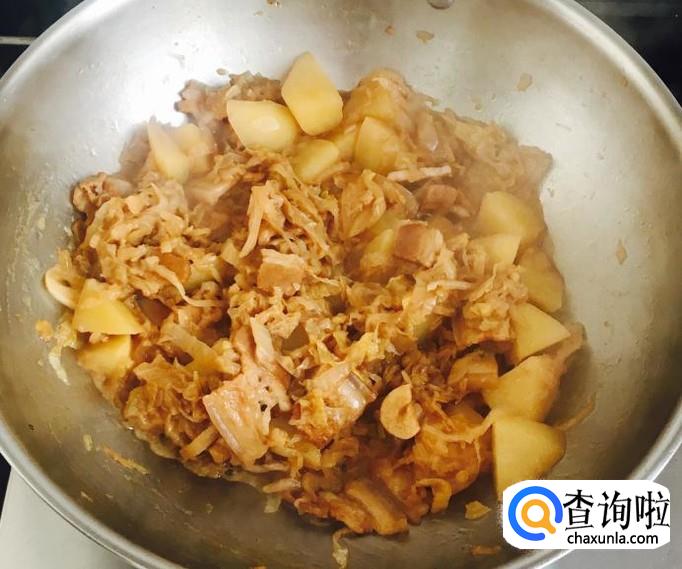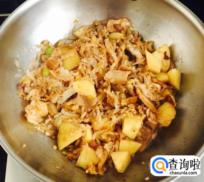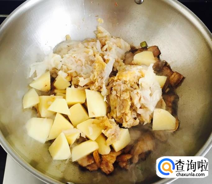 倒入土豆块和酸菜丝翻炒均匀使其充分吸收油脂