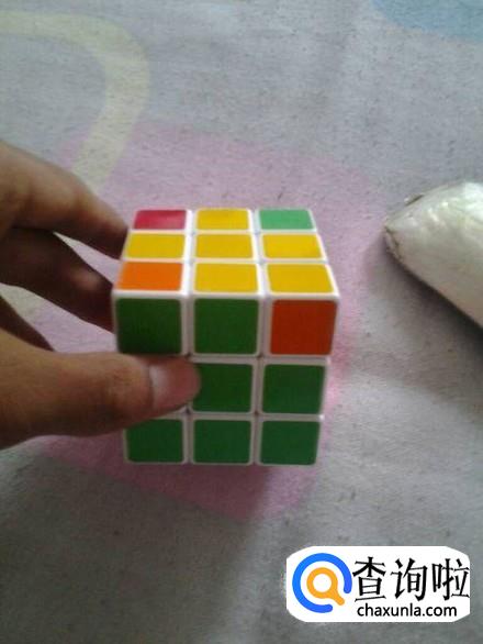 然后要对白色底面的四个角。首先确定颜色,因为底面角块有三种颜色。要根据他们的颜色确定位置。以白绿橙为例,这个小块需要移动到下面来,让白面冲下就还原成功了。