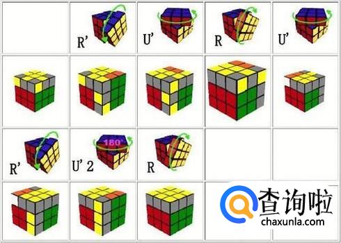 将两角同色的边要将黄色设为前面。两角同色的边放在右边。使用公式RRDDR'U'RD'D'R'UR'就可以将四面都换成同色的边。没有两角同色的边也是使用上面的公式,就会发现出现第一种情况。