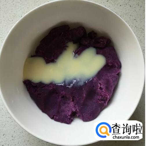 再把紫薯粉用手搓成泥,再把炼乳取30克加在装紫薯的碗里。