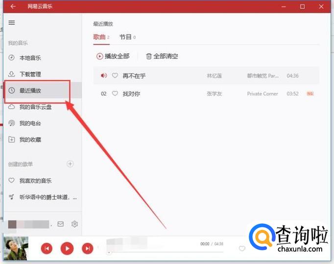 点击“最近播放”即可查看之前播放过的歌曲记录,如图所示。